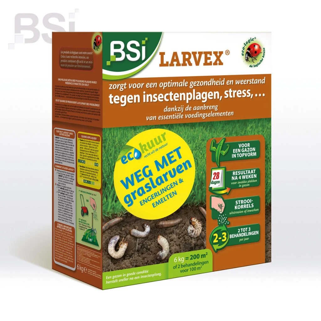 LARVEX verdrijft op een ecologische en bijzonder krachtige manier engerlingen, emelten en andere bodeminsecten. Dit product heeft een complexe samenstelling met uitsluitend natuurlijke grondstoffen. Larvex verhoogt de planteigen weerstand van het gazon tegen de nadelige gevolgen van bodeminsecten. Door sterke stimulatie van de grasplant, onder meer door toegevoegde voedingselementen, gaat het gazon een krachtig nieuw wortelstelsel ontwikkelen. 3 Ã 4 weken na de behandeling groeit het gazon opnieuw keurig dicht.