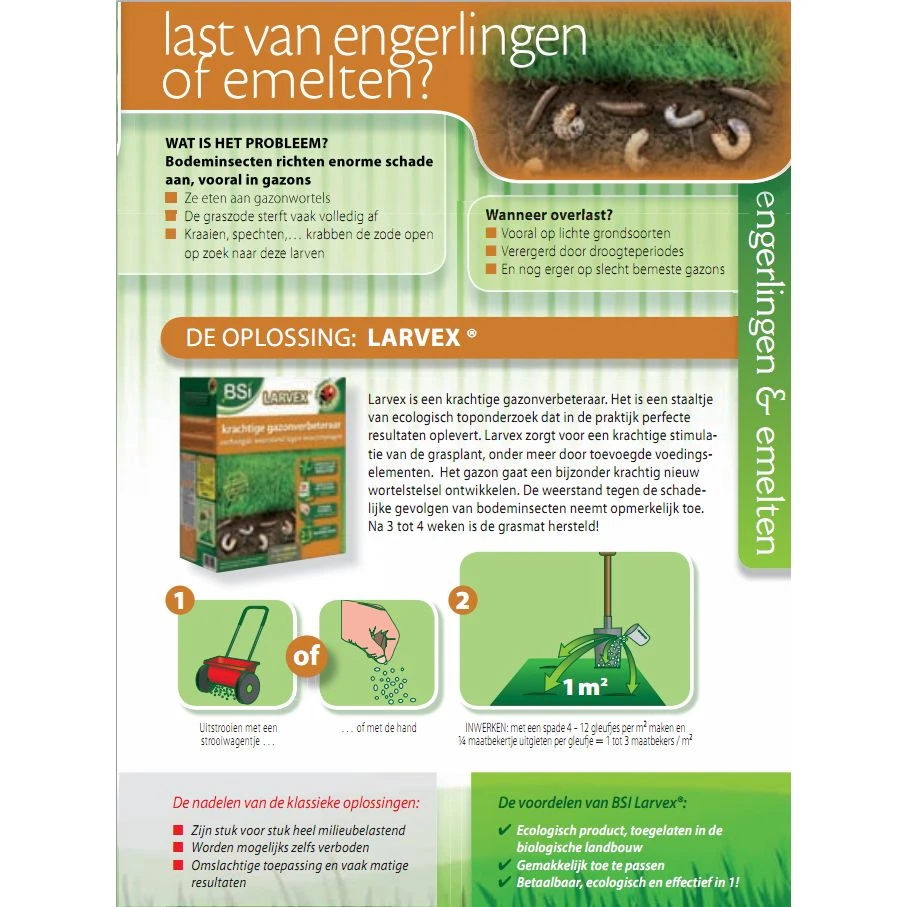 LARVEX verdrijft op een ecologische en bijzonder krachtige manier engerlingen, emelten en andere bodeminsecten. Dit product heeft een complexe samenstelling met uitsluitend natuurlijke grondstoffen. Larvex verhoogt de planteigen weerstand van het gazon tegen de nadelige gevolgen van bodeminsecten. Door sterke stimulatie van de grasplant, onder meer door toegevoegde voedingselementen, gaat het gazon een krachtig nieuw wortelstelsel ontwikkelen. 3 Ã 4 weken na de behandeling groeit het gazon opnieuw keurig dicht.