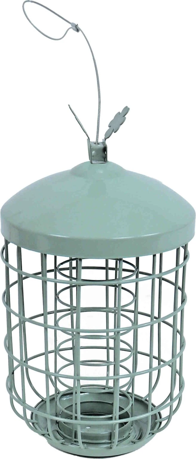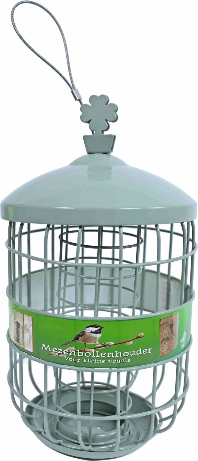 De metalen mezenbolhouder in de kleur grijs / groen is een eyecatcher voor in de tuin of op het balkon. Met de metalen mezenbolhouder kun je genieten van de kleine etende vogels. Het metalen fijnmazige rooster is speciaal ontworpen voor de kleine vogelsoorten. Doordat de metalen mezenbolhouder fijnmazig is, is het onmogelijk voor de grote vogels om de mezenbollen te pikken. De bovenzijde van de mezenbolhouder kan los gemaakt worden, waardoor de mezenbolhouder makkelijk gevuld en schoon gemaakt kan worden. De metalen mezenbolhouder is gemakkelijk op te hangen door het ophangsysteem van metaaldraad.