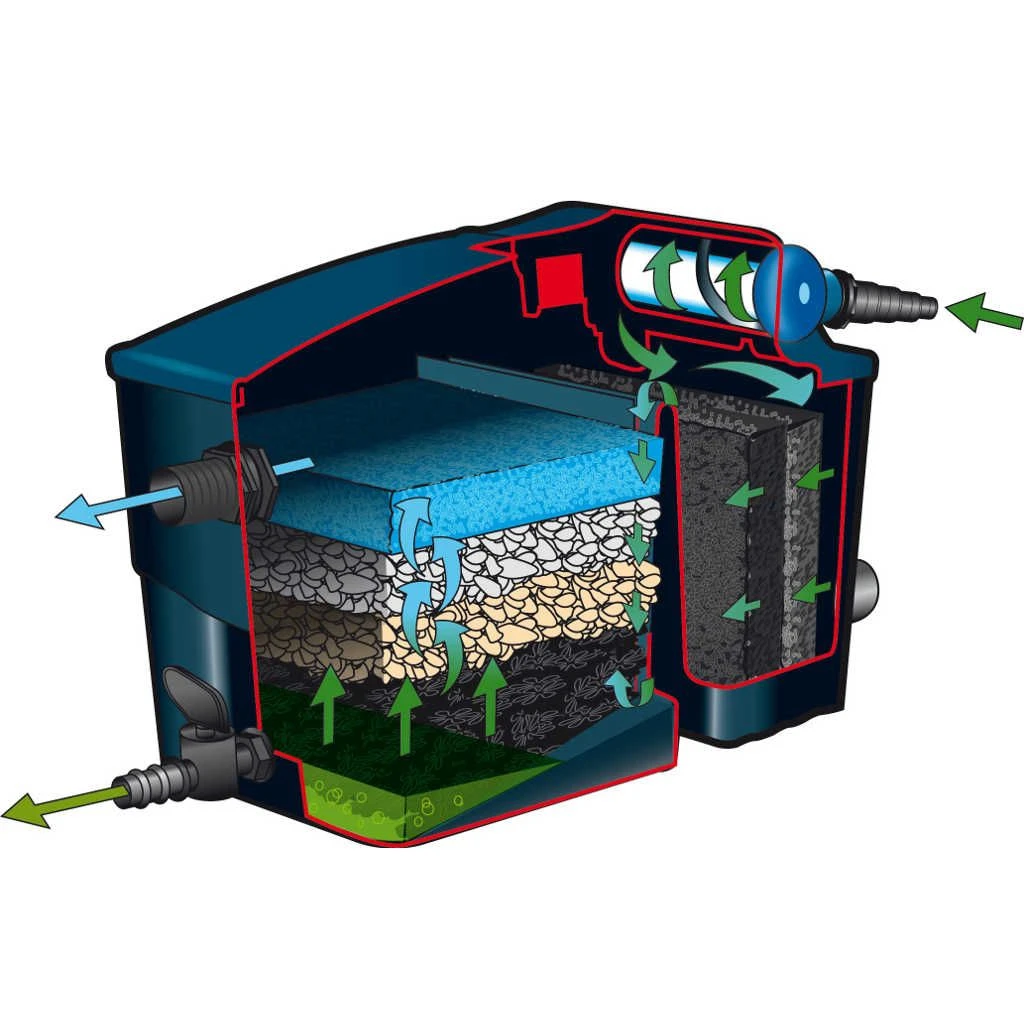De Filtramax 9000 plus set is een gesloten filtersysteem met 2 kamers. De kamers zorgen voor een biologisch-mechanische reiniging. Het filtersysteem met 2 kamers zorgt voor een grondige reiniging. Een groot voordeel van de Filtramax is dat het een parallel systeem is, dit betekend dat je meerdere Filtramaxen op één vijver kan aansluiten. De Filtramax 9000 plus set is geschikt voor een vijver van 4000 tot 9000 liter zonder vissen, met vissen 2000 tot 4500 liter. Is jou vijver groter dan dit dan kan je meerdere Filtermax filters plaatsen. De Filtramax 9000 word geleverd incl. vijverpomp, UVC-apparaat en filtermedia.